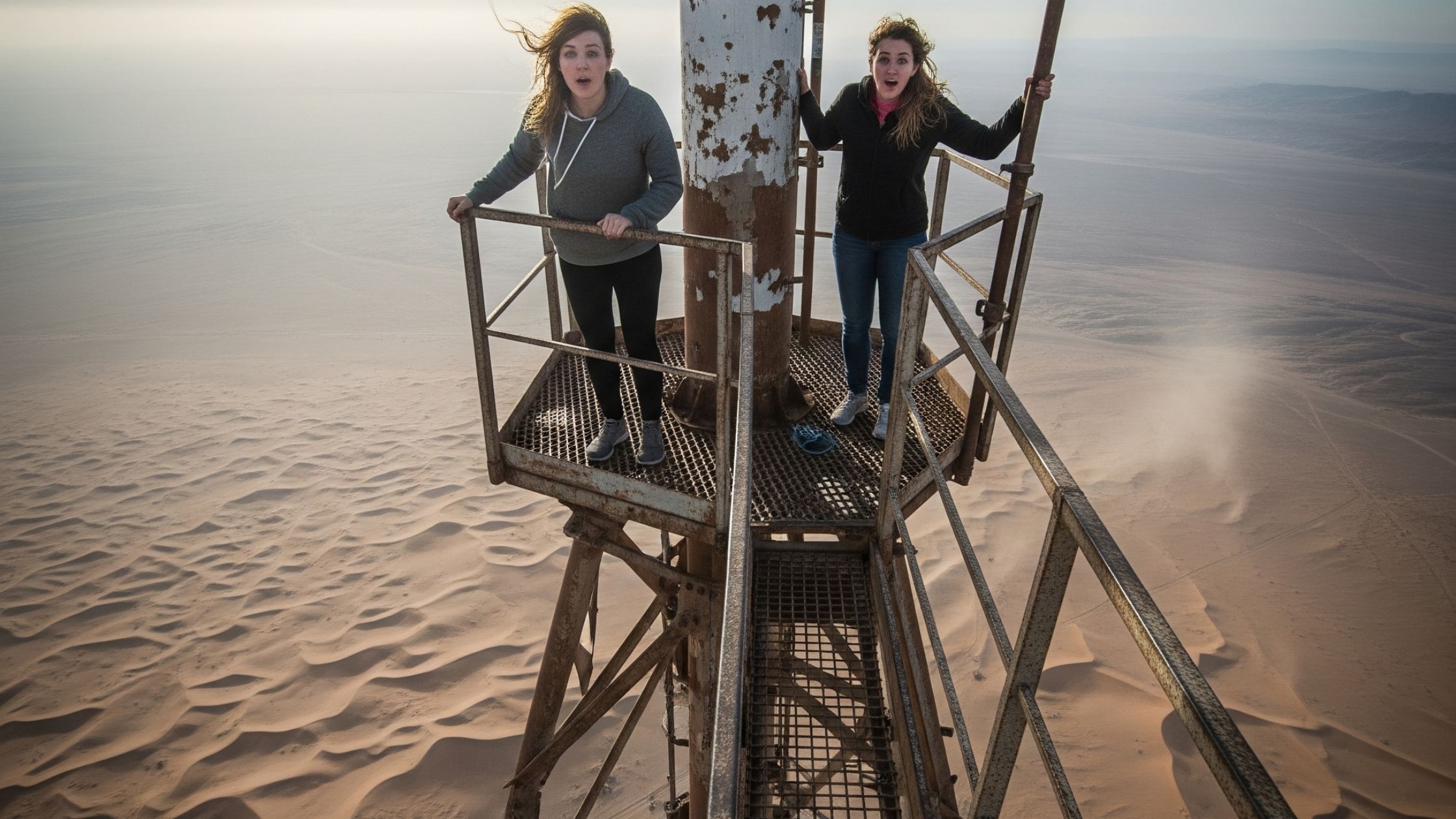 その後二人は、さび付いたハシゴを慎重に登り始める。ときおりハシゴのねじが外れながらも、なんとかタワーの頂点へ到達。